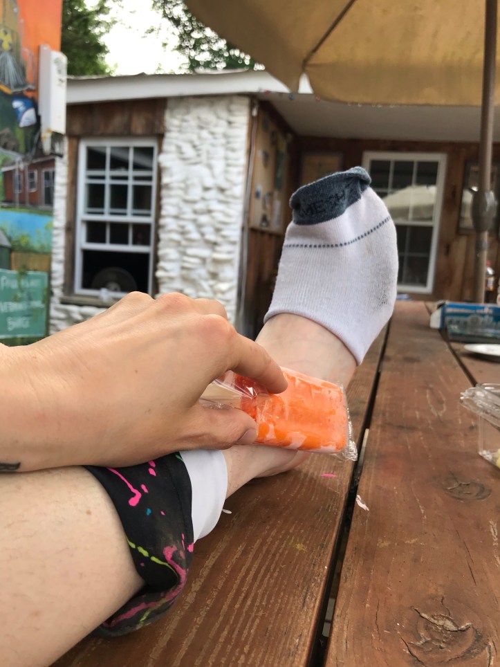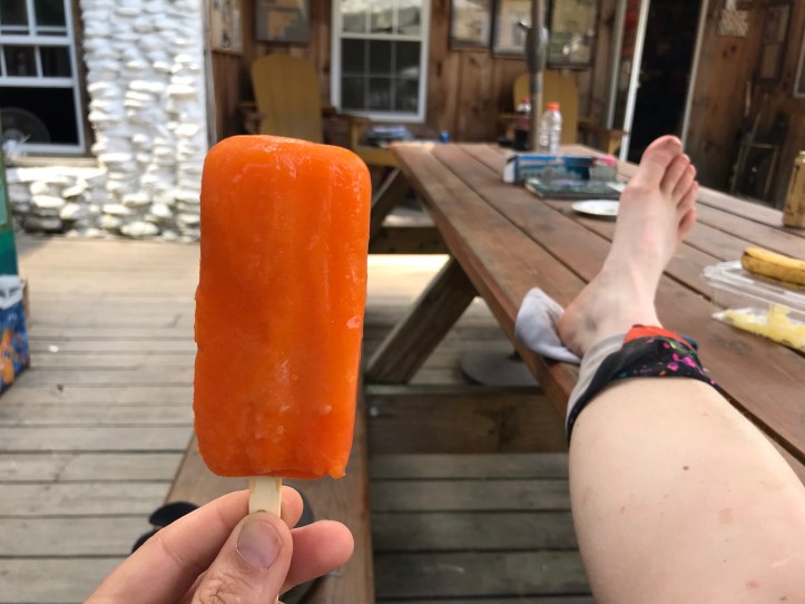 As I walked down the pathway behind the outfitter, I saw the hiker that I find challenging and a cast of familiar people around him. Their names are Freckles, 6pack, snackpack and John. I put my boxes down and Went back to look for soda and to grab my pack from the outfitters where Sara had dropped it. The soda machine was sold Out of all things selections so I passed. There wasn’t any access to ice, so I found an orange popsicle in the ice cream freezer to put on my ankle. The clerk looked at it and inexplicably Gave it to me for free.
