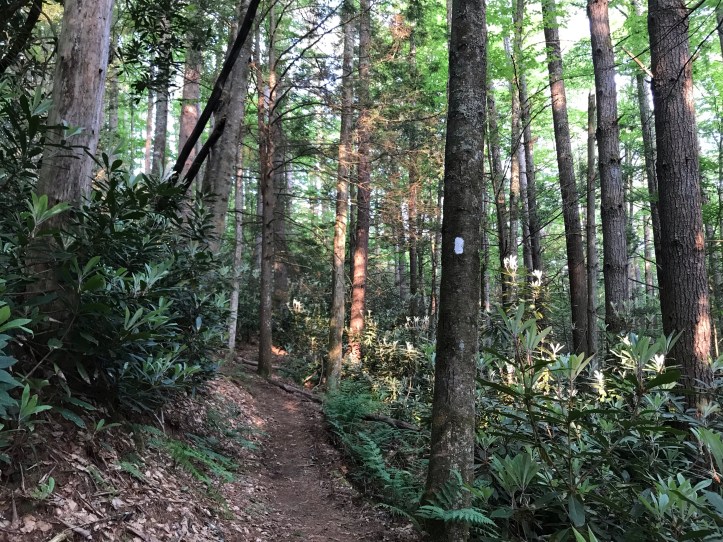 The trail finally went downhill and through a series of switchbacks surrounded by rhododendrons and boulders. I continued to feel lonely and anxious about camping by myself again. The trail dropped lower into greener and shadier woods with a light breeze.