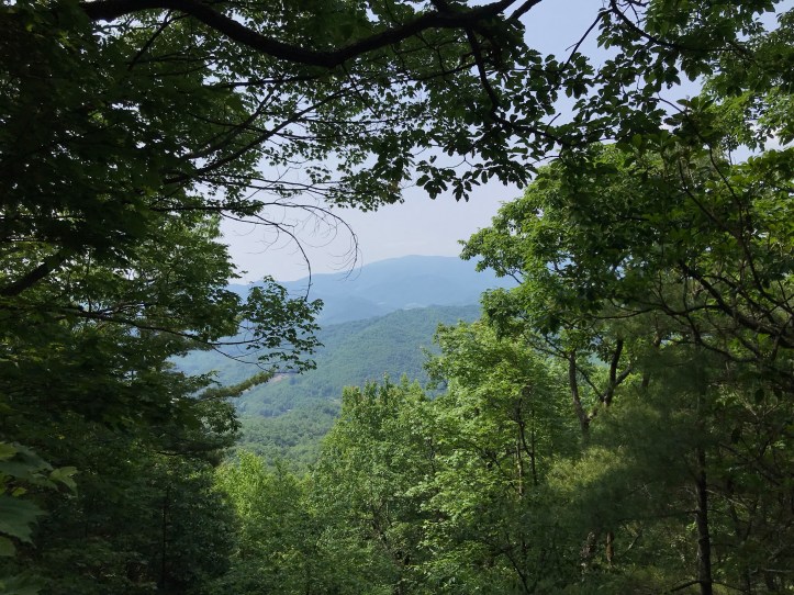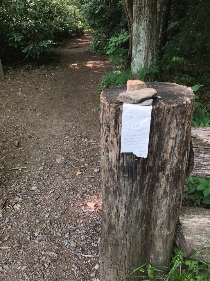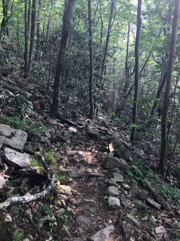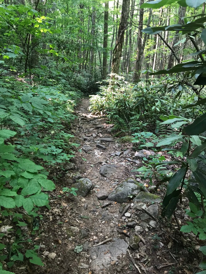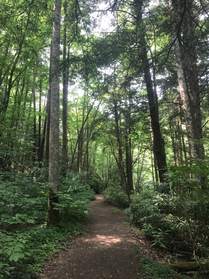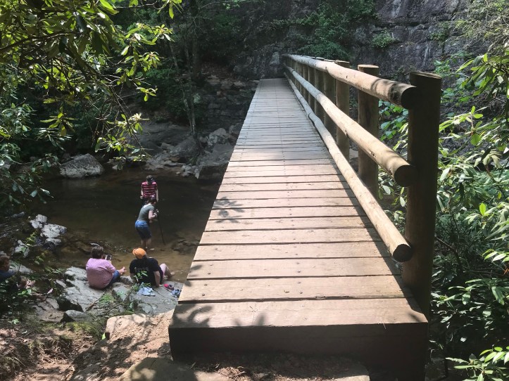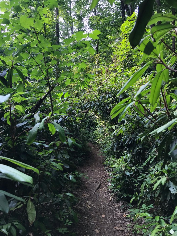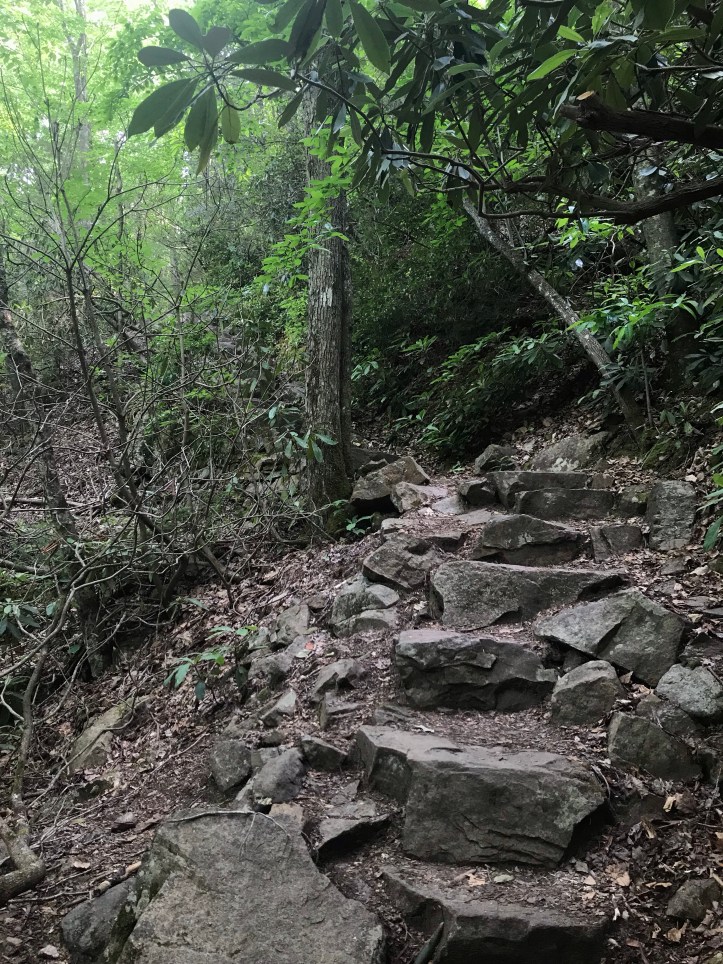 I walked along a wide flat shell trail high above the banks of the rushing laurel fork river. I took a quick pitstop to dump a scoop of water over my head and wrists. Then I crossed a footbridge with a family hanging out in the water and made my way up a set of stone steps.