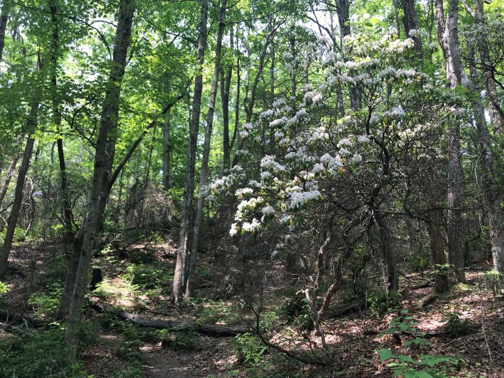 I passed a rangy, tall mountain laurel in full bloom as the trail climbed into even less shaded woods with a strong breeze. The path was peppered with mountain laurel blossoms. I went through a sunny stretch with hazy mountain views and a tufted titmouse (at least I think so based on the shape).