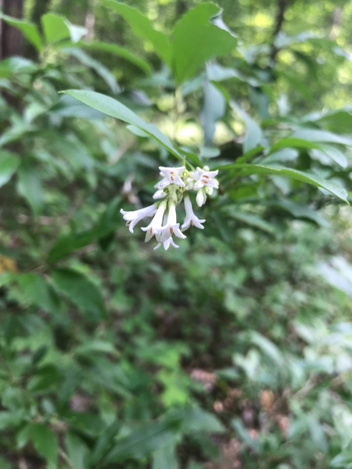 It finally eased up a bit as I passed a farm building that reminded me of tobacco drying sheds in NC. I smelled something sweet and found that this white flower was the source.