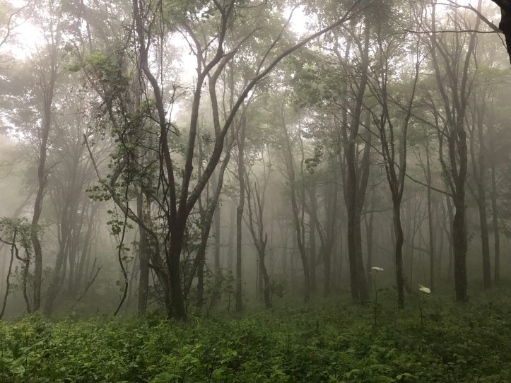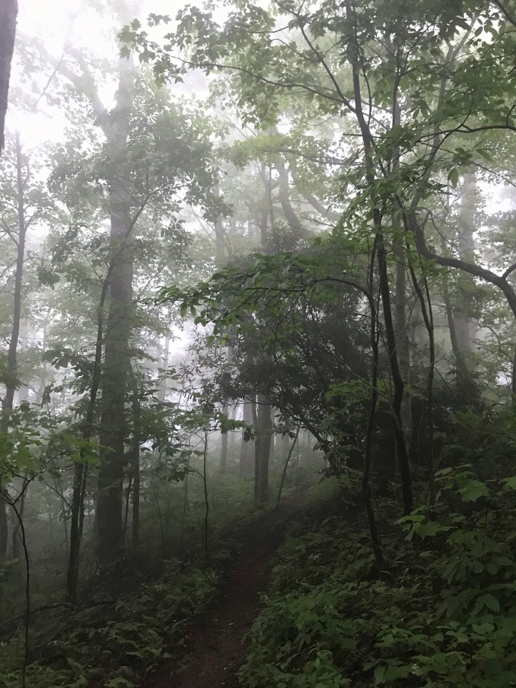 And the answer is: I will never sleep in same shelter as banana again. He sounds like he’s being strangled.when he snores. He also very unfortunately makes sounds that reminded me of the gurgling made by the unconscious (likely already dead) hiker for whom I helped provide CPR several weeks ago. I slept so poorly and felt so angry the whole time because if you KNOW you snore that badly: warm people! or sleep in your tent! I was so awake in the middle of the night that I used my mediocre phone signal to post overdue pictures to social media. It rained on and off throughout the night. My watch alarm went off at 6am but there would be no need to hurry behind the shelter for sunrise views because of the thick fog hanging over everything. I did, however, want to get miles in while it wasn’t actively raining so I got and walked towards my food bag. Before retrieving my bag, I went down a little ways off the trail and took care of business among the rhododendrons and saplings. My food bag came down with no complications. I went back to the shelter and ate breakfast on the edge of the sleeping platform. I changed into my damp, smelly hiking shorts and put on the previous day’s socks and shirt because I didn’t see the point in putting on dry clothes on a day that’s guaranteed to have rain. May as well save them for later since I won’t be in Damascus until Saturday.