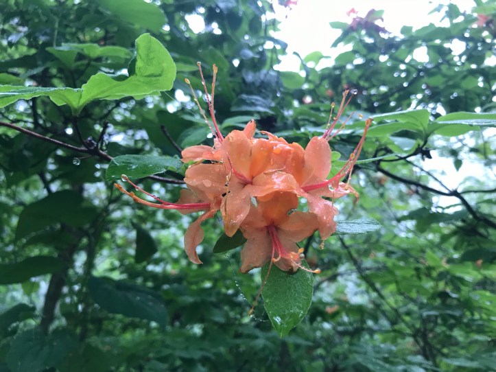 After about 4 miles and one water stop, the terrain finally leveled out to a very reasonable series of mild rollercoaster hills combined with long easy flat stretches. I made pretty good time for quite awhile save the occasionally rockier footing where I forced myself to slow down to prevent sloppy feet. The trail was annoyingly overgrown so I brushed against wet leaves constantly but I was extremely grateful for the fact that it wasn’t actively raining. Flame azaleas popped out of nowhere on occasion and the woods were thick with fog for much of the morning.