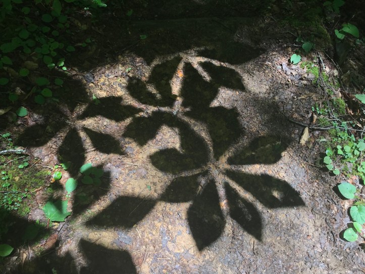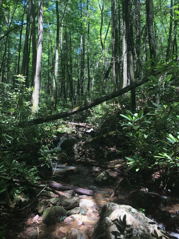 Around 11, we Sat at a small tent site and had a snack. I took off my right shoe and Massaged my arch which was still very cranky. We Listened to the small tap of a woodpecker that wasn’t visible in the thick leaf cover as we finished off our snacks.