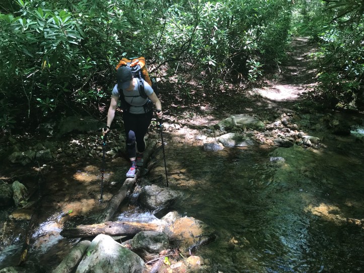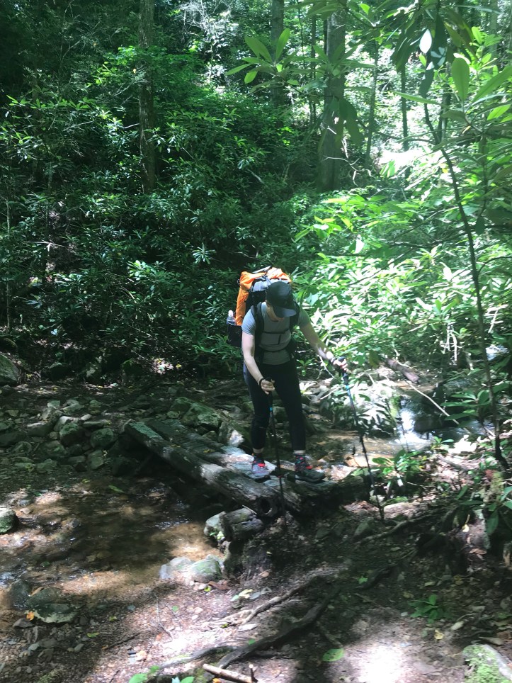We both took pee breaks in the rhododendrons and got moving again. Halfway to the shelter! We Crossed over a swollen stream where the only option for dry feet was to balance beam across a small log.