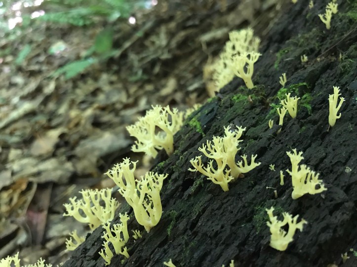 Then we Walked through more rhododendron tunnels. I Stopped to make notes and Oakland found an abundance of fungi to photograph. Stopped to get water and Oakland got distracted by coral mushrooms.