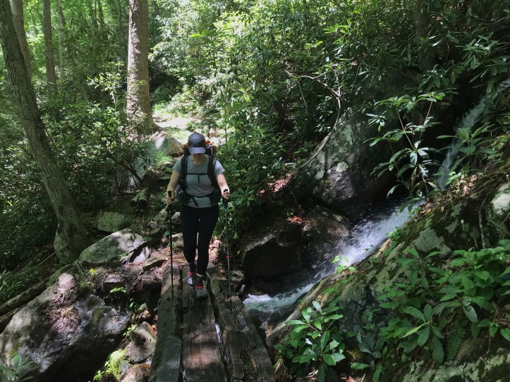 Then we Crossed a road and a newly constructed footbridge over whitetop laurel creek, which was the source of the loud rushing noise we’d heard a mile back. After the bridge, I took a soggy step in which muddy water Nearly went over the top of my shoes.