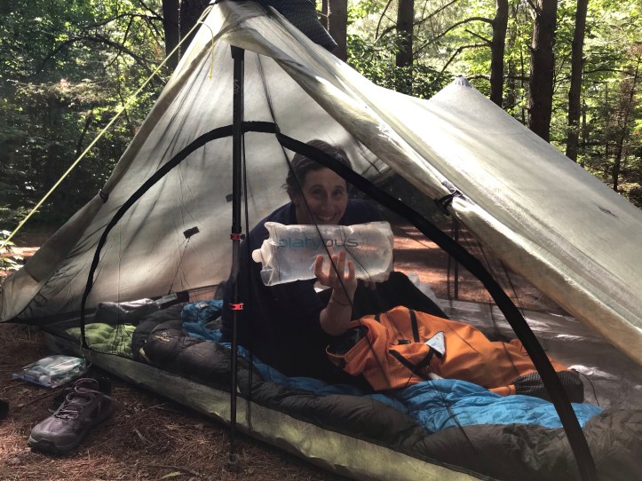 I suggested we fill our water with the CA platypus, which managed to top off all 4 bottles. That’s not quite enough for tomorrow morning, so we walked down to the water supply and filled a sawyer bag. For now we are doing most things together until Oakland has had a few chances to practice things. Then came trips to the privy and wardrobe changes in the tent. I shared my new shirt and new socks philosophy. New people arrived as we lay in our tent. One of them was accompanied by an adorable and energetic mutt that was only mid-calf height. She ran around the campsite sniffing and wagging her tail and then bolted full speed back to her owner. I felt too lazy to get out and say hello but I watched her run around with glee and laughed from my cozy spot. Then I settled in to write up the days notes while Oakland reviewed the docket for tomorrow.
