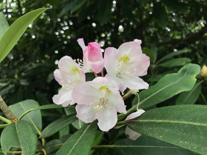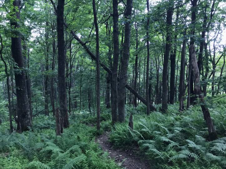 It already Seemed like it was going to be a hot day. We Crossed the road and went up a short hill that led us to a slightly breezy ridge and back down again with the road in sight off to our left. When the breeze died down i could feel the heat of the morning. Oven birds expressed their opinions as we picked our way over rocks. We crossed another road and walked over an abundance of Broken glass in the first few yards of the trail. Whyyyyy. We made our way Up a hill through blooming rhododendrons.