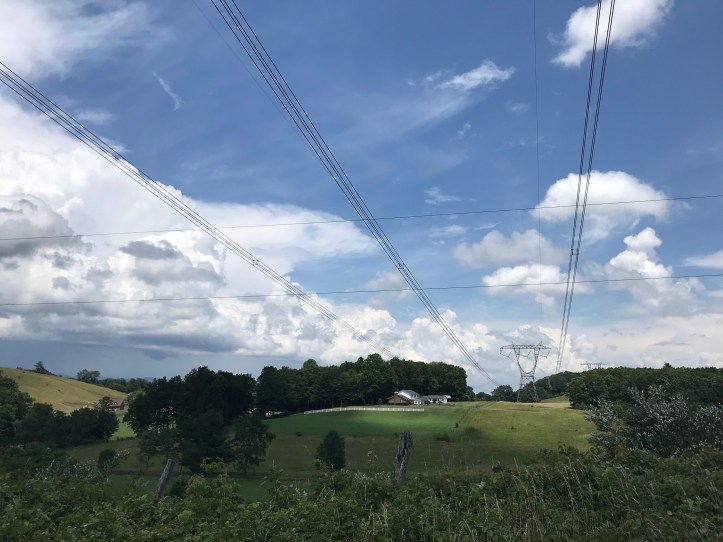 The Thunder got louder and longer as we walked. We stopped and Pulled out ziplocks for our phones and peed before it decided to rain. Then we Continued through rhododendrons until the forest opened up and led us through two separate power lines, the second of which had a low hum that could be heard from a quarter mile away and was covered in poison ivy.