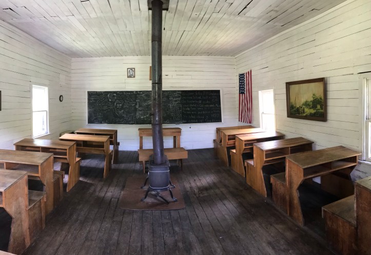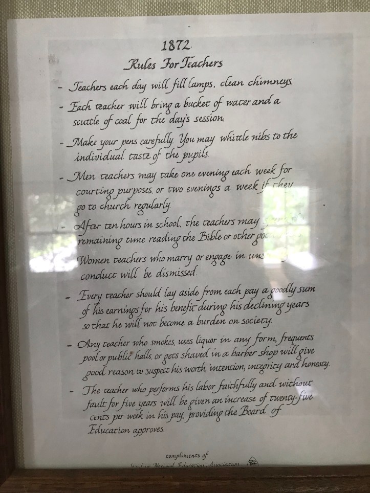 crows cawed in the distance as we put our packs down to check out the inside of the schoolhouse (today’s top picture). We marveled at the desks and read the teachers rules with horror because of the gender disparity.