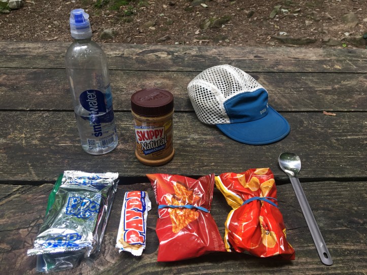 Then We sat at the picnic table and took off our shoes and socks to air out our feet. Oakland unwittingly bought the waterproof altra lone peaks for the hike, so her feet are nice and warm because the waterproofs don’t breathe as well as the regular version. I spread out my array of lunch foods and felt both excited and horrified by the combination. Pop tarts, Fritos, Doritos, skippy, and 3/4 of a payday.