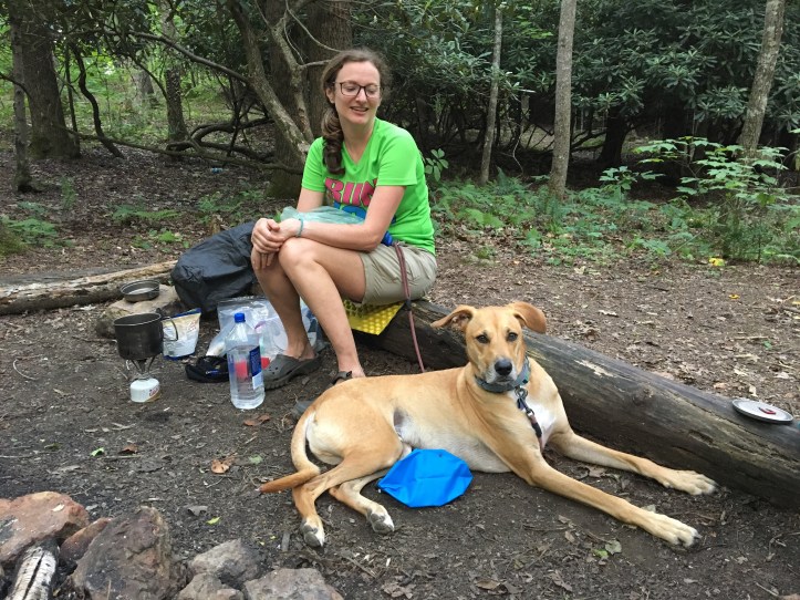 Very unfortunately we also had a thunderstorm on our heels so I suggested we walk and cry to keep moving. We wound through dark woods with little ground cover for only a few more minutes before reaching the tent site. The woman who lost the dog bowl yesterday was already setup. We greeted each other and finally got her name (tea time) after having seen her about 4 times in the last 24 hours. We surveyed the scene and determined the best spot to be right at the high edge of the campsite across the way from our company for the evening. Oakland put a rock on top of a small patch of poison ivy and we proceeded to set up the tent to the sound of thunder. Then we walked around in search of a bear line tree. We found a limb that I feared would be too low once it had weight in it but our options were limited for trees that didn’t involve getting our ropes in a morass of poison ivy. I got my line over on the second try (another indication that the limb might be too low). Oakland made her throw onto the same limb on her third try. With that chore successfully done, we grabbed our cooking gear and food bags and joined teatime and blaze (the dog) by a fire ring at a lower set of tent sites. Here they are (it was hard to get them both looking at the camera at the same time).