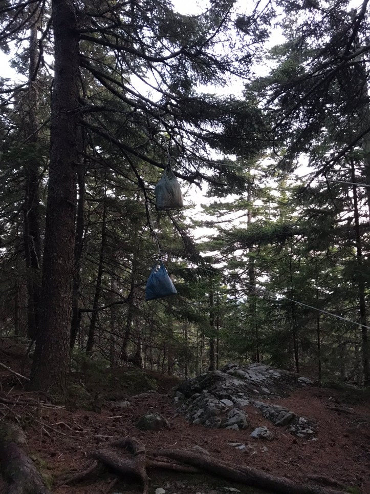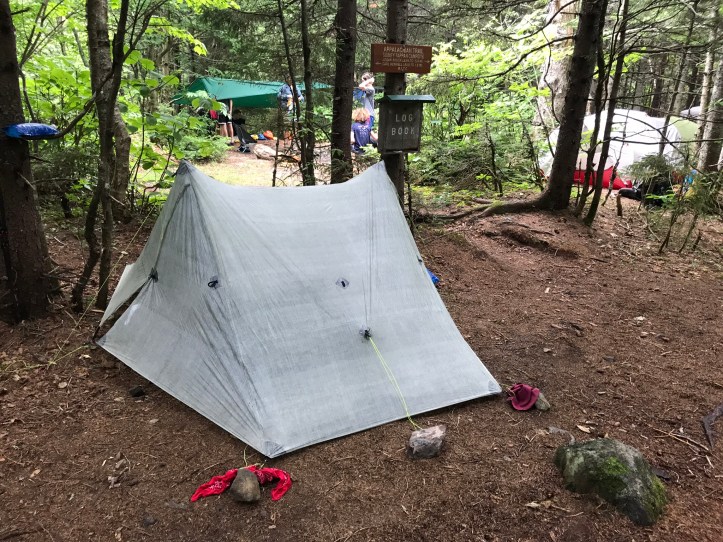 We eventually found out that there were 3 different youth groups at the campsite along with a handful of hikers. We decided to cram ourselves just to the edge of the trail with our tent spilling partially ON to the trail because there weren’t any other options. The two counselors came over to say hi again and offered us chocolate. They asked about our hikes, which is how we found out that they had thru-hiked in 2017, but neither of them looked familiar to me. They moved on so we could keep setting up. We cleaned the area of tiny pine cones and added some pine needles to the most concave section to try to flatten it out. We had to break off some lower partial branches on the pine tree on one side of us to avoid puncturing the tent door on that side.