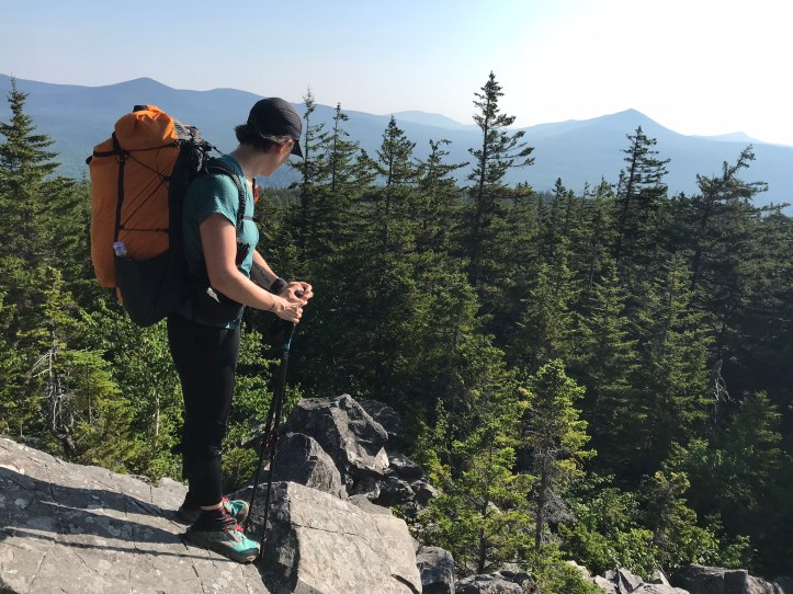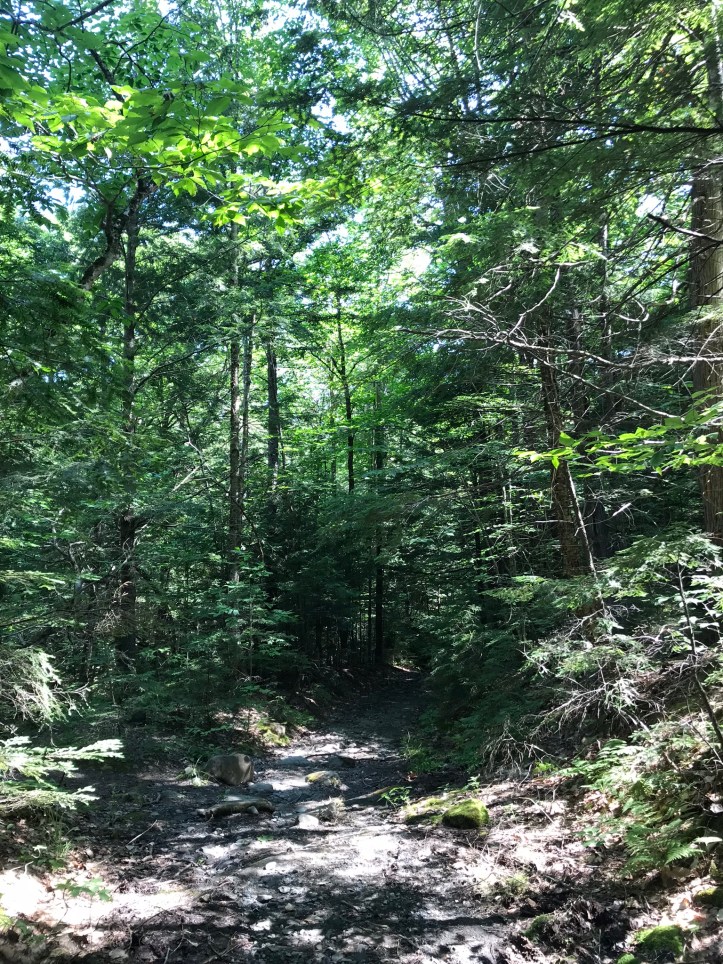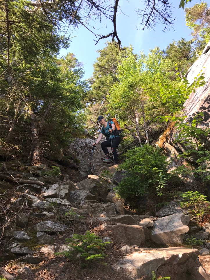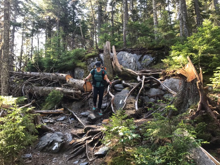 Levi passed us on a downhill and was super chipper about his new shoes. His long steps and fast pace sent me down a spiral of resenting tall, male-bodied people for their physical advantages relative to our compact stature. I feel resentful of tall people in general, but more so the male-bodied variety because they bring up other issues of privilege that are impossible to un-see. We went through a series of doodley-doos, which for Maine means short stretches of pine needle bliss and a series of sharp ups and downs like this.