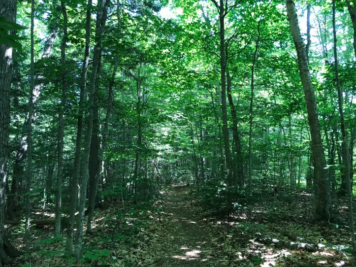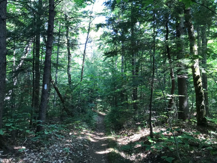 We left the populated stream bank and continued north over flat, beautiful trail with easy footing. We turned left and went through stand of virgin pines that were far taller than any pine I’ve ever seen with a smattering of goliath birches as well. The trail was easy for the next mile and a half, and we both reveled in the simplicity of taking many steps in a row without having to contort ourselves over roots.