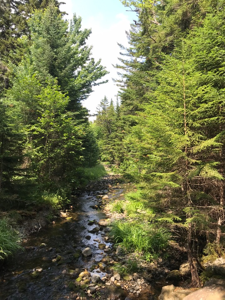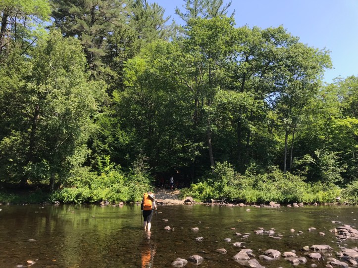 Oakland crossed ahead of me and moved at a decent pace. I went across at a snail’s pace, feeling grateful that the water was shallow with good visibility. The rocks were indeed a bit flatter, but I still had several painful steps. When I reached the other bank, I sat on a rock to dry my feet/legs and put my gear back on. A loud troupe of four SOBOs sidled up to the stream. The lead hiker announced to his group, “we usually just leave our shoes on for this.” The hiker in back said, “Yeah! what’s the point in taking them off!” in a super macho voice. They hardly broke stride for the first few feet, and then they all began sloshing around as their shoes slipped over the rocks. Oakland and I rolled our eyes at their bravado. She talked to the youth group counselor while I put my gear on. We collected/filtered water from the stream despite the slow and frequently traveled source. Levi and the two guys blew through in their camp shoes. I continued to be really jealous of their ability to do that while simultaneously uninterested in the extra weight. Though it did seem like carrying them for the state of Maine would have been a good idea. Three northbound day hikers crossed the river with two dogs. One was a giant barking doodle and the other one was a tiny, curly-haired muppet.