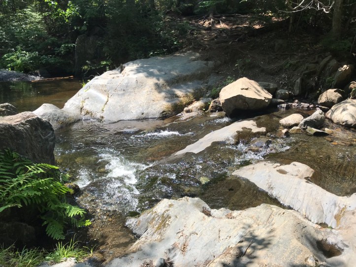 We decided to have lunch on the rocks at the edge of the brook. Little did we know the world would tromp through. After struggling to find a comfortable spot, I settled down to make my peanut butter wrap. I bemoaned my dwindling chip supply as Oakland worked through her tuna wrap setup. The trio of day hikers with the dogs stood at the intersection for a minute before heading our way to cross the stream. It didn’t look like the easiest crossing, and the dogs got all of the stepping stones wet. I cringed as the humans stepped down onto the newly soggy rocks, but everyone managed to get across without slipping. Another day hiking couple bumbled across with a hyper springer spaniel that decided to go for a quick swim. The troop of mostly tall, gangly teens came through in their crocs and took various routes across the water. A small family with two tweens that appeared to be twins with very different haircuts and a dog also made it across uneventfully. It became comical how many people walked past us, but the number of dry crossings also brought up the dreadful memories and shame of having taken a spill yesterday.