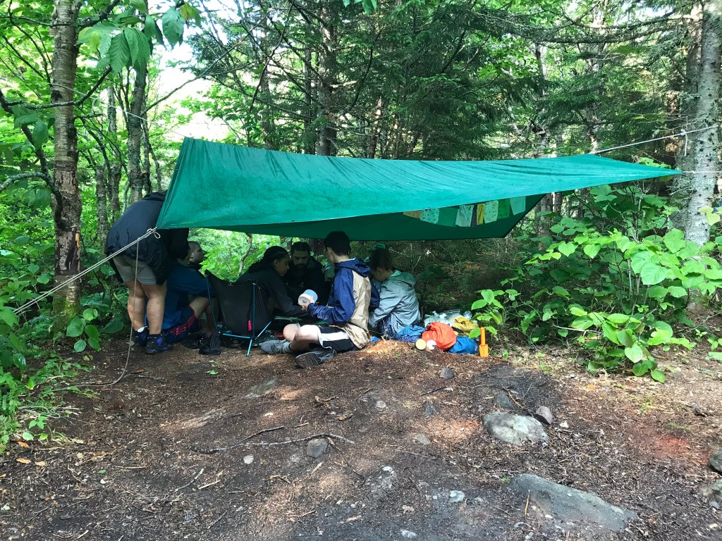 We were settled inside our tent by about 6:45pm, which felt amazing. We changed clothes without flashing the world as best we could because closing the doors took more energy than either of us had. Oakland puttered over the map, and I looked at my pictures while a swirl of inane teenage conversations went on around us. Oakland fell asleep around 8pm while I typed haphazard notes and tried to stay warm in the damp evening air. I’m finishing this to an array of zipper sounds, kids attempting to be quiet and erupting into giggles, counselors gossiping in their tent, the wind rushing through the pines, and the occasional plop of moisture on our tent. Now that it’s dark, I can sneak out for one final pee and go to sleep at a decent hour for the first time in Maine. Fingers crossed we don’t have any uninvited guests looking for tent snacks overnight.