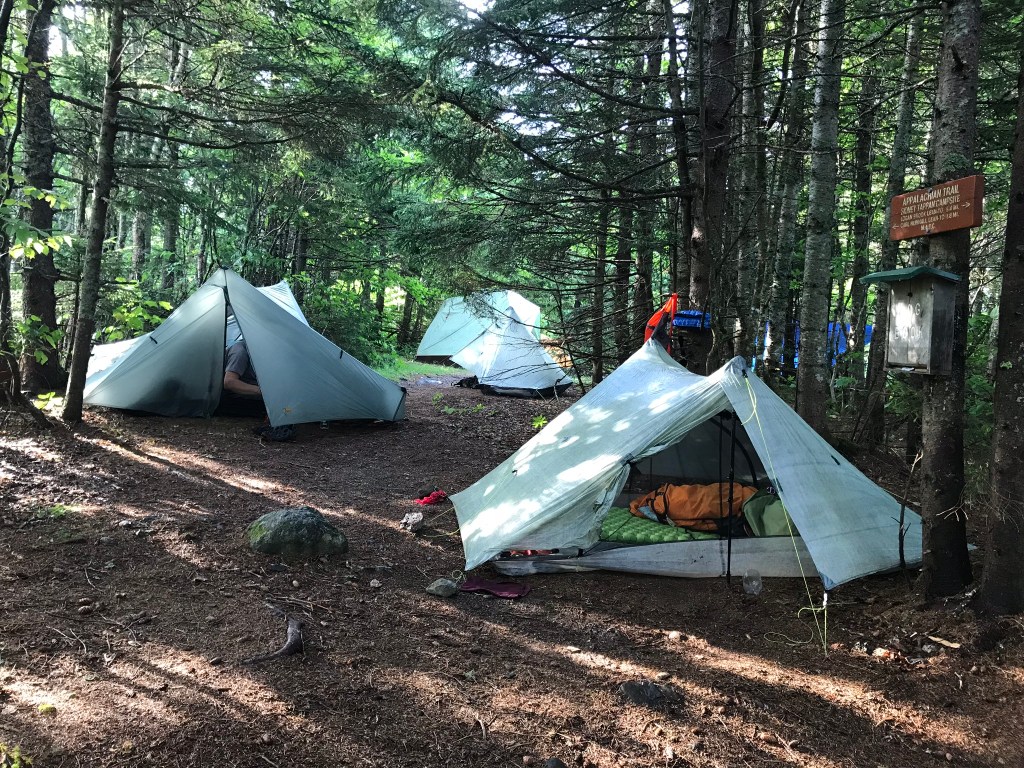 The two guys we had leapfrogged with finally showed up about 45 minutes after we did. They walked around wide eyed at the density of hikers, and then plopped their tent along the other side of the trail across from us. We were all a bit frazzled. Today’s top photo is a view of tents crowded around the AT (the mossy rock is in the middle of the trail).