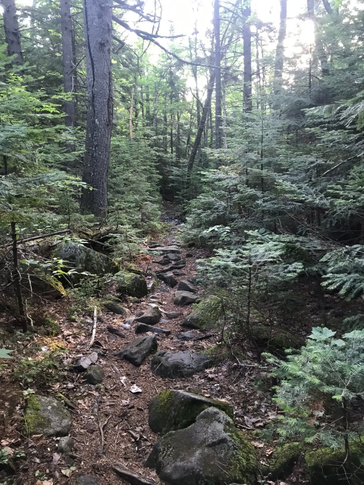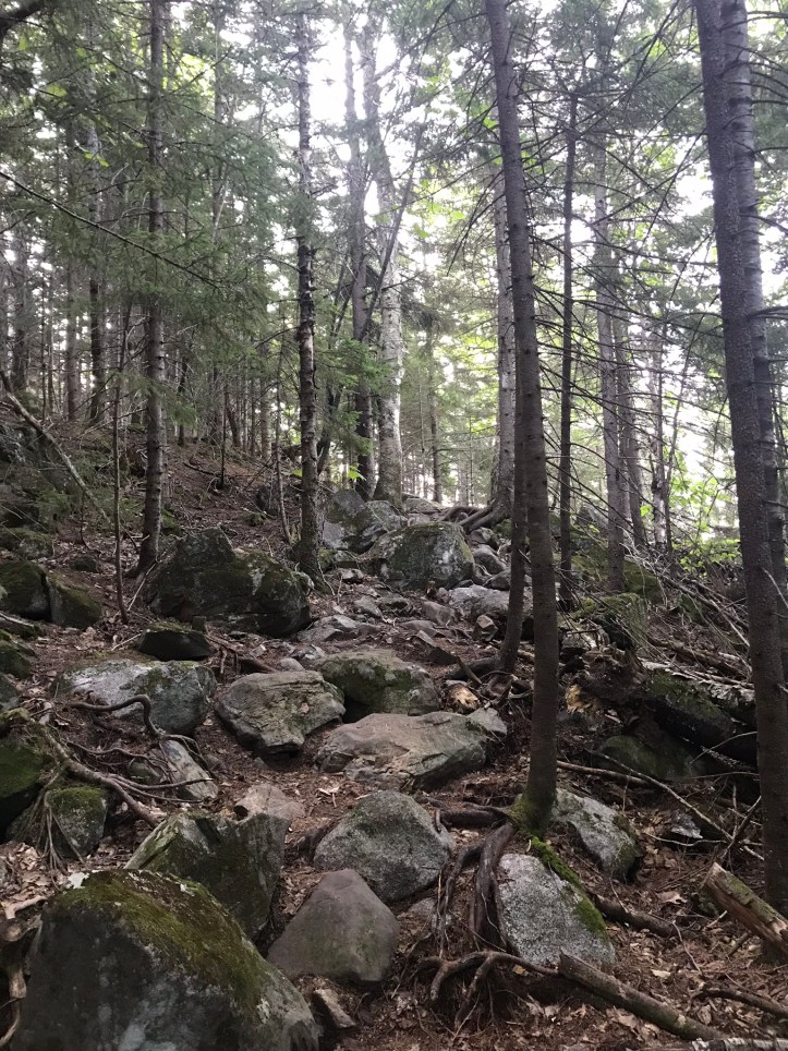 Once we crossed, the bug situation devolved into another mosquito mordor. Our deet was clearly wearing off, but neither of us wanted to sacrifice the time for reapplication (tactical error). We rushed through spacious pines with the occasional boulder slalom in the middle of the trail.