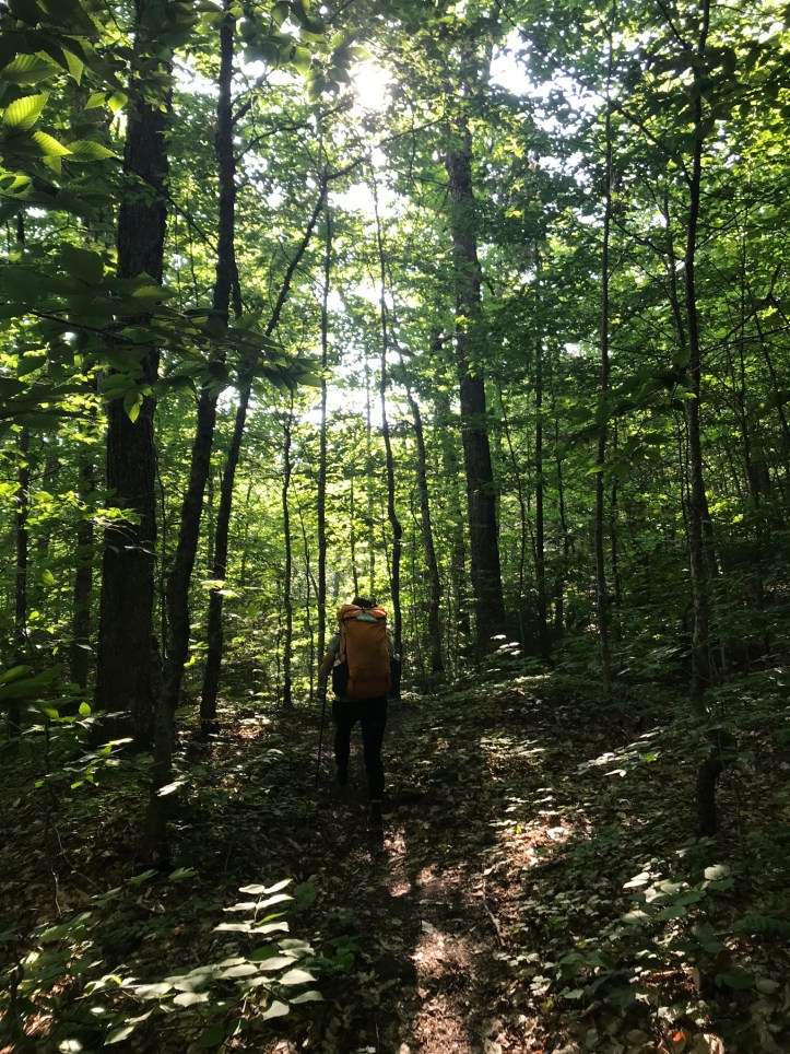 I had a choppy, but decent night of sleep. We woke up on the early side, and took turns feeding the mosquitos in the proverbial rhodies. I had the bonus feature of dealing with my period, which meant extra water for hand washing and extra mosquito bites. By the time I made it back to the tent, I was exhausted and dismayed by the fact that it was only 6am. I took a couple of painkillers and went through the pre-breakfast packing routine. Then we had an uncomfortable but blissfully bug free meal on our sleeping pads with a chorus of birds chirping, mosquitoes buzzing the mesh doors, and bullfrogs from the pond. The morning light was soft and beautiful, but the humidity made me dread the rising sun. We packed up the rest of our gear and then doused ourselves in high octane deet after exiting our fabric fortress. Oakland wandered up the hill to attend to additional duties while I started breaking down the tent. She returned with a mosquito bite on her forehead, which was both amusing and pathetic. At some point, I had to stop what I was doing to locate the tiny dagger in my shoe, which turned out to be a wood chip embedded in my sock. It’s safe to say, we were both a little frazzled by 6:55 when we said goodbye to our pond site and clomped back towards the AT.