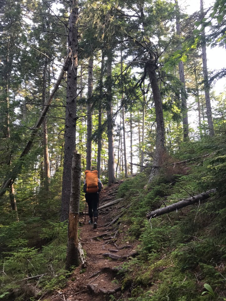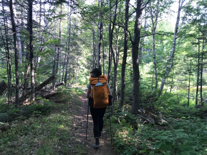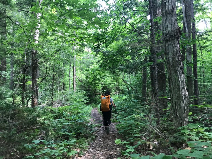 The trail narrowed, got a bit curvier and the mosquitoes thickened to miserable proportions. They landed on my arms two at a time. I swatted at them (in vane) with one hand and held my poles in the other while dodging rocks and trying to hold our faster pace. The air was completely still and we were both boiling. When I checked our mileage, I was dismayed to find that we still had 0.7 miles to antlers campsite. In that moment, it may as well have been 5 miles. I didn’t know if I could make it that far without more bug spray, but I stubbornly didn’t want to stop, and I had been hoping to not put more chemicals on my body so late in the hiking day.
