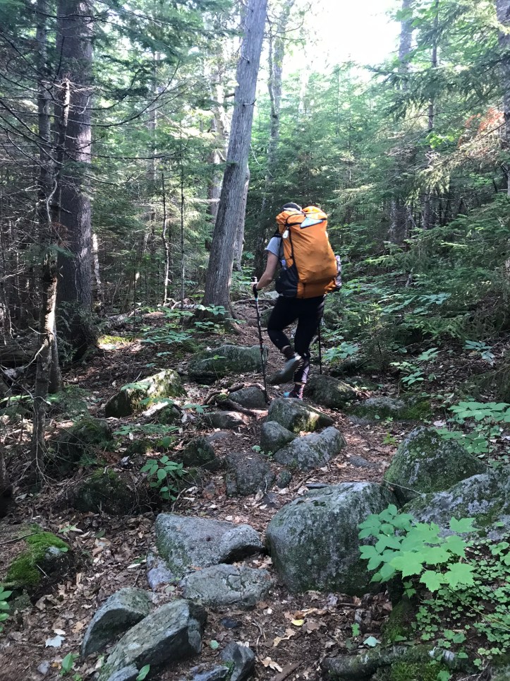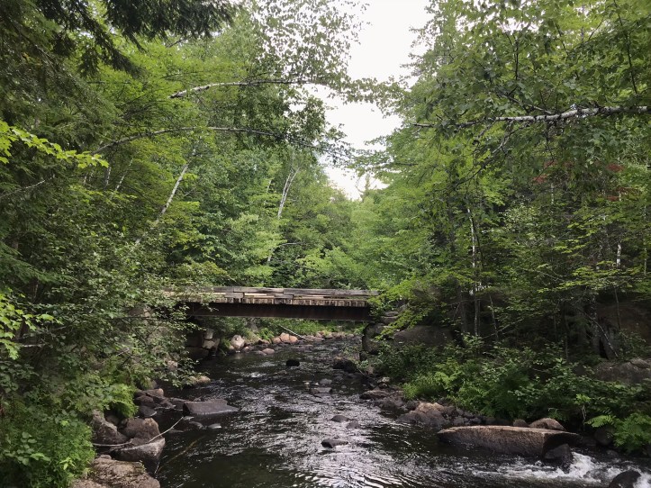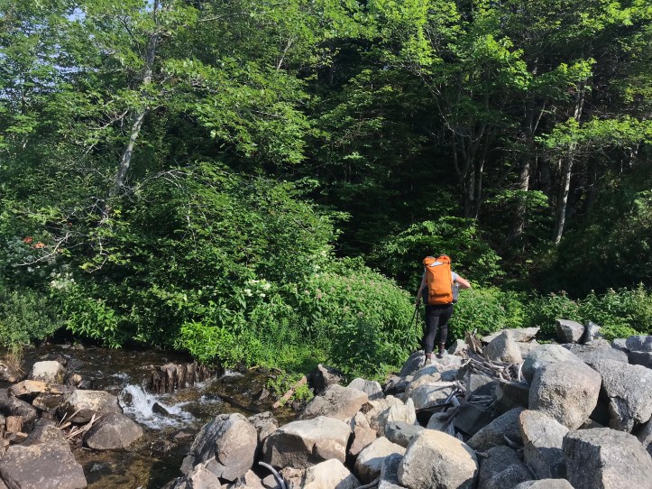 We covered 2.8 miles in the first hour with a few slow downs for rocks and bog boards, but mostly clear (Maine) sailing. I was grateful for the easier terrain in the midst of another silly edition of “outrunning the tall people.” That is, until we reached a tricky stream crossing that sent me into a fit of despair. The rocks were spaced far apart and there was a rope strung across the water, which is never a good sign. Oakland offered to go first, and I accepted.