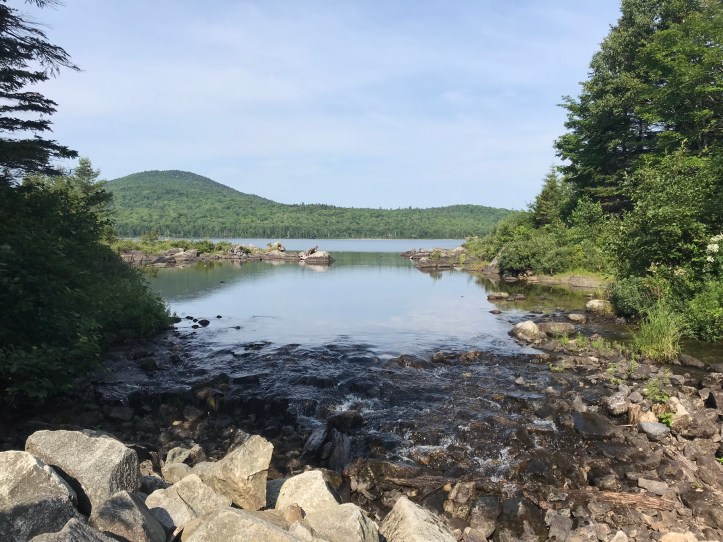 We arrived at Jo Mary Rd at 1:05pm, a full two hours earlier than we’d anticipated. We had hiked at 3mph for the last few miles because of the easy terrain and the inhospitable state of taking breaks. We dropped our packs at the road and tried to find a good spot to relax. The air was still and the bugs weren’t as bad as expected, but still highly irritating. We grabbed our packs and crossed the bridge to see about a brook side perch. Our first selection turned out to be way too buggy, so we crossed back over the bridge, went south on the AT for about 50 yards, and edged out onto a set of large rock slabs that extended to the middle of the brook. There was a nice breeze and a combination of shade and sun for shifting body temps. We took our shoes off and dipped our feet in the cool, fast moving water. I tried to ignore a sad little dead fish that sat on the exposed rock and instead focused my attention on a dark green frog lounging in a small pool of water amongst the rocks. It didn’t seem to care about eating any of the bugs swirling around it. Rather, it lazed about in the water with its legs extended, changing locations every now and then.
