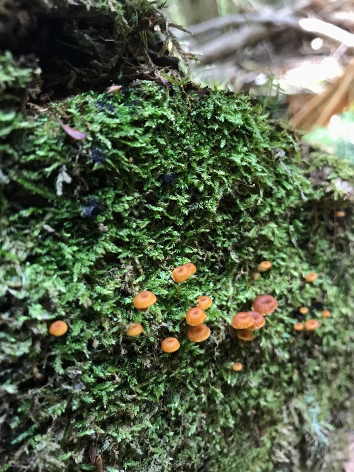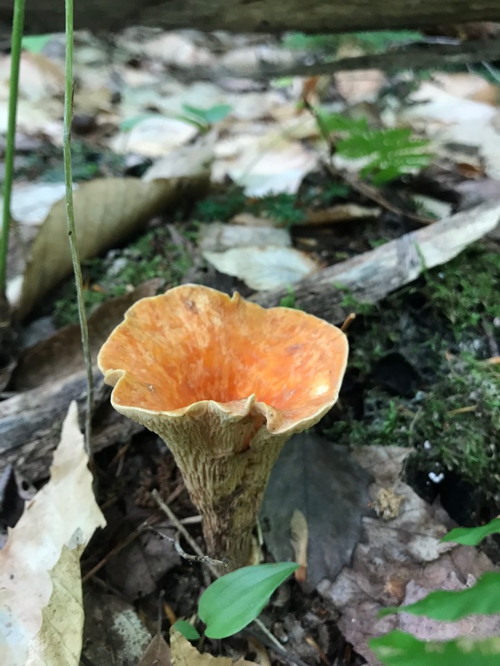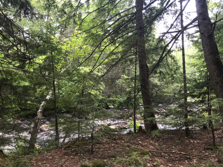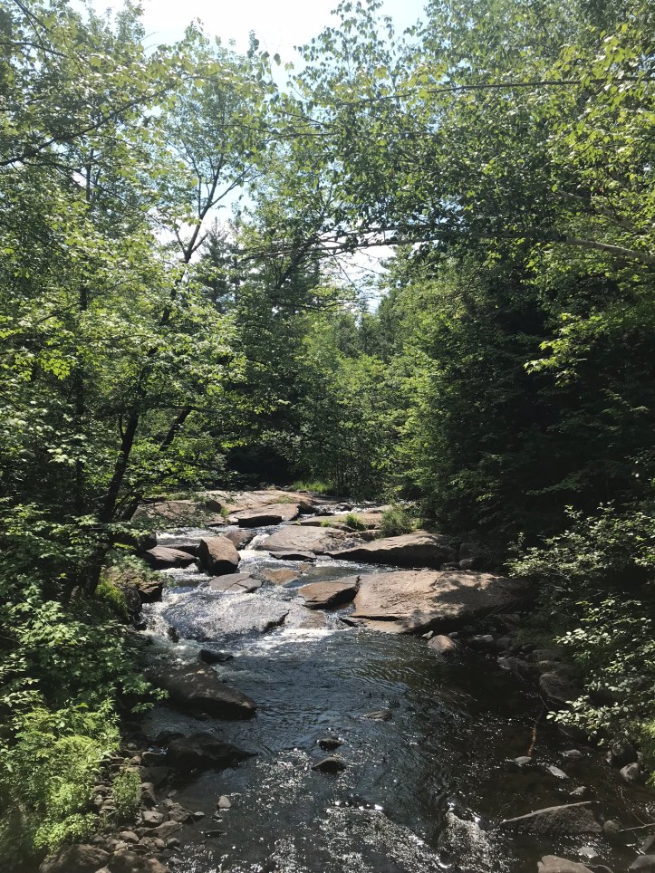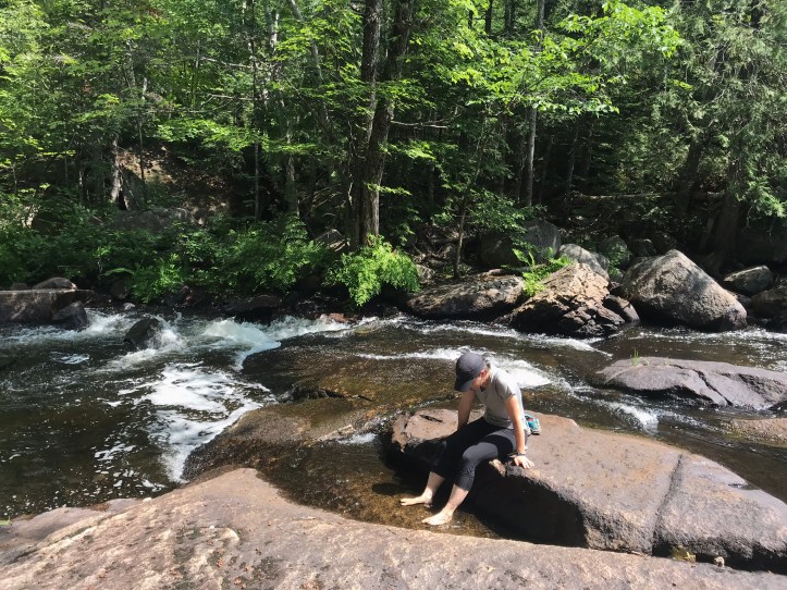 After lunch, we hiked through more of the same terrain with a wide trail, giant rocks and smurf-worthy mushrooms with large orange caps, all of which made us feel like we’d been shrunken and were walking through a giant’s world. Cooper Brook rushed to our right and looked delightfully cool compared to the sticky, humid woods.