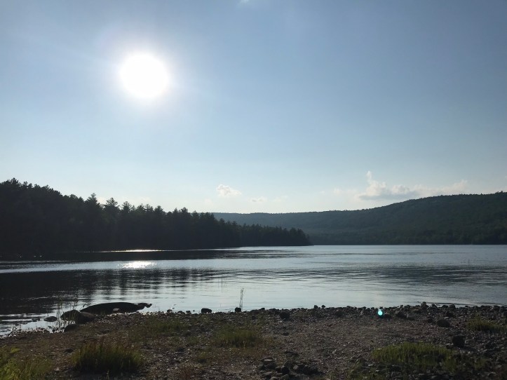 We finally saw water through the tress on our right and entered the Antlers camping area. A group of teenage boys, half of whom were shirtless, huddled in a circle playing cards. We walked past them and dropped our packs at a decent tent site. I ripped my raincoat out of my bag and took partial solace from the bugs. We quickly perused the rest of the camping area, assessing the sites for size, ground obstacles, and view. We finally settled on the tent site at the point. It was small and somewhat boxed in, which would mean poor air flow, but it was the most private, and we had access to both east and western views. I cleared the ground of as much rubble as I had the patience for, with the exception of one very pointy rock that I couldn’t pry out of the ground. The smaller rock I had been using as my grooming tool snapped in half as I dug around the edges of the pesky rock. I gave up to avoid cutting myself. We decided to put a camp towel over it and hope for the best.