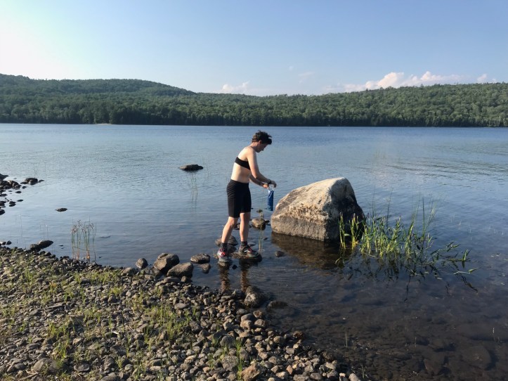 After a few more chores, we considered walking out into the water to cool off, but we decided against it because we still had a boatload of bug spray on our skin and there were sharp mussel shells on the shoreline. I had no desire to cut my foot (and with my luck around feet, this felt like a plausible outcome). I also remembered all too well the infection my stepdad got from a mussel shell. No thanks. We compromised by taking our shirts off and spending the next hour with an extra breeze. We went out to the point and collected water, making sure to drink a bunch to make up for the fact that we barely stopped all afternoon despite the heat.