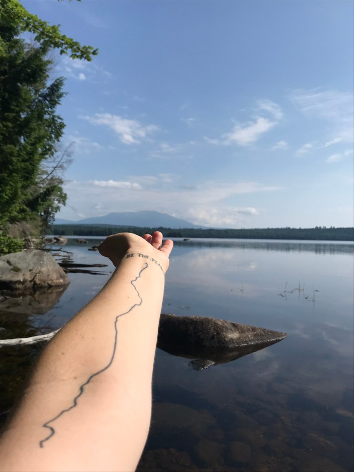 We took our usual break around the two hour mark and sat on a mossy rock. I forced down a quarter of a bar and checked guthook for the view of Katahdin that was somewhere on the morning’s agenda. We had apparently already passed the side trail that led to the view. I remembered seeing a path not that long ago, but I had been in too much pain to care about it in the moment. We decided to leave our packs and backtrack so I could take a picture of Katahdin with my tattoo, which I had forgotten to do when we were standing on White Cap. I always feel like I’ve landed on the moon when I hike without my pack. The weightlessness put a noticeable bounce in my step, even with the continued discomfort. We turned left onto the side trail and quickly arrived at the edge of Pemadumcook Lake. Katahdin loomed over the far edge of the water.