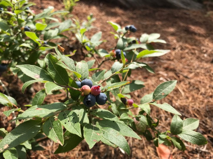 After about an hour of hiking, we crossed a logging road and found a small patch of blueberry bushes that were full of ripe berries.