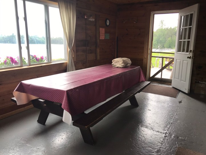 After getting clean, we passed on the outrageously huge loaner clothes and opted to hang out in our camp shorts and our own shirts. I washed our various toiletry and food towels at the washing station by the cottage, which consisted of an old school iron hand pump that pulled water directly from the lake. A couple of canoes sat next to the washing station. Exploring the lake would have been a prime zero day activity, but neither of us had the energy to take advantage of the canoes on our tighter time line.