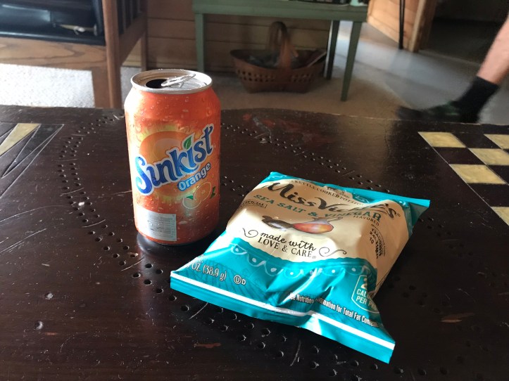 Oakland and I dropped our stuff in the tiny, wood-paneled room. I felt like a space cadet, and I was happy to be done with hiking for the day even though it had gone by quickly. Neither of us could muster the energy for a shower, so we dallied with AB on the couches in the main room, eating a bag of chips and drinking orange soda.