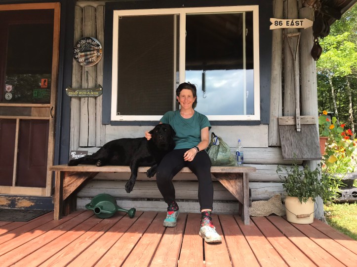 With all of our braincells officially taxed by the logistical whirlpool, we moved on to lunch. We wanted to keep chipping away at our food weight, and we knew we were planning to eat hostel food for dinner, so we opted to make hiker lunches with the addition of sodas and dessert from the hostel’s resupply. We went back up to the main building and waited for Bill to let us in. His black lab kept us company on the porch: