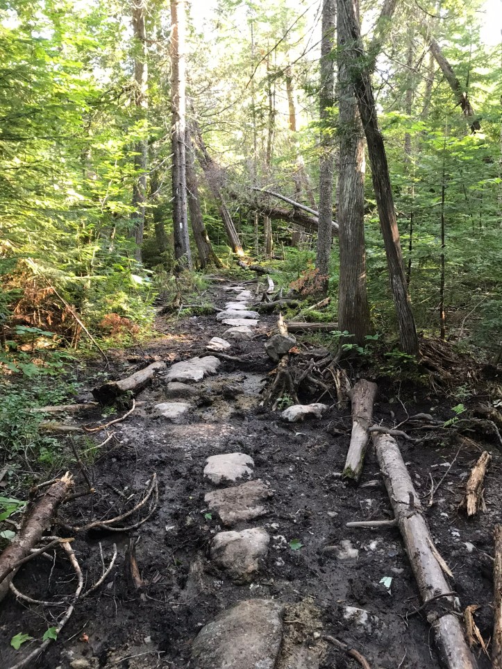 We stopped to survey the options and about 5 mosquitoes landed on my legs. I killed two of them with one slap to my right calf (somewhere along the way I must have removed my calf sleeves because I can remember seeing the blood and the instant fiery itch of those effing mosquito bites). There was no time for pickiness about our route. I took the right hand option and Oakland went left. We ended up at same point at the same time and congratulated ourselves for a swift retreat from yet another mosquito Mordor. Then came a smattering of boulders and tree roots and another boulder hop across sludgy water right before the shelter.