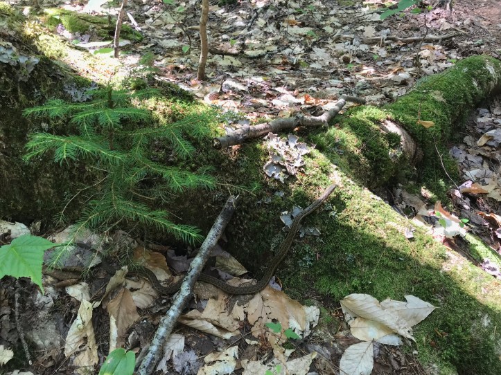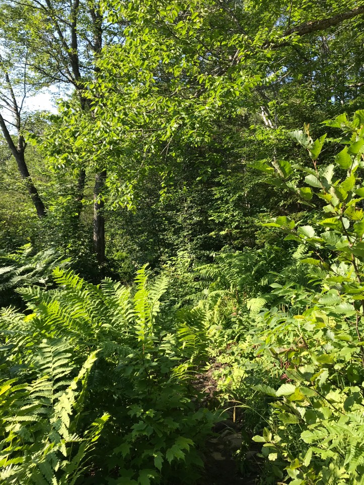 We eventually came to a small hill and decided to remove our raincoats. We applied deet to our top halves, drank some water and kept moving through a slightly overgrown, greener section of woods.