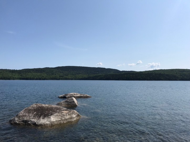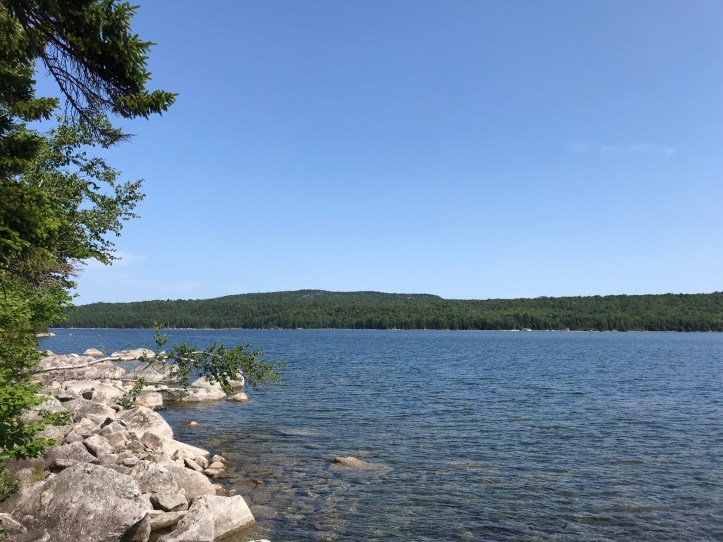 We walked along a rock slalom with occasional stretches of root snarls and blow downs. A large body of water sat to our left. I dipped down a rabbit trail to check it out. The sparkling, clear water looked so inviting even on this mild morning.
