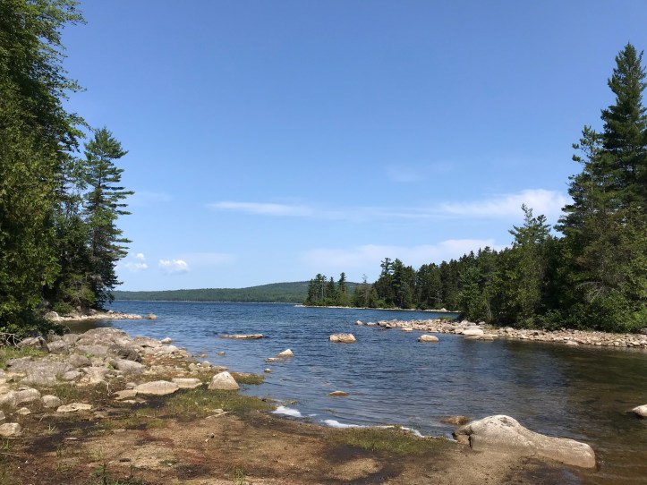 I even walked around the far right edge to see if I could catch a better view of the opposite corner. I heard a squeak as a frog flew through the air, legs akimbo, and fell back into the water. I hoped that I hadn’t accidentally stepped on it. I reluctantly went back to the tent where Oakland lay massaging her feet without having to be badgered by me. Mary Jane stood brushing her teeth in her long johns. I got in the tent and changed clothes, which Oakland had wisely already done. As we shifted around, she accidentally kicked me in my bad ankle. There was a sharp pain from the impact followed by a dull ache, and I had trouble letting my leg rest against the sleeping pad. I felt so tired of being constantly vigilant about my damn ankle. Oakland’s sleeping pad was balanced between roots because she was too stubborn to let me take that side of the tent. We heard loons making their evening salute as I wrote notes in the waning light. It turns out Mary Jane is a snorer. Thankfully she’s far enough up the hill for it to be a low rumble. I’m finishing this to the sound of water rushing over rocks, Mary Jane snoring, Oakland sleeping next to me, crickets, and a plane somewhere in the distance. It’s our last night in the 100 mile wilderness!