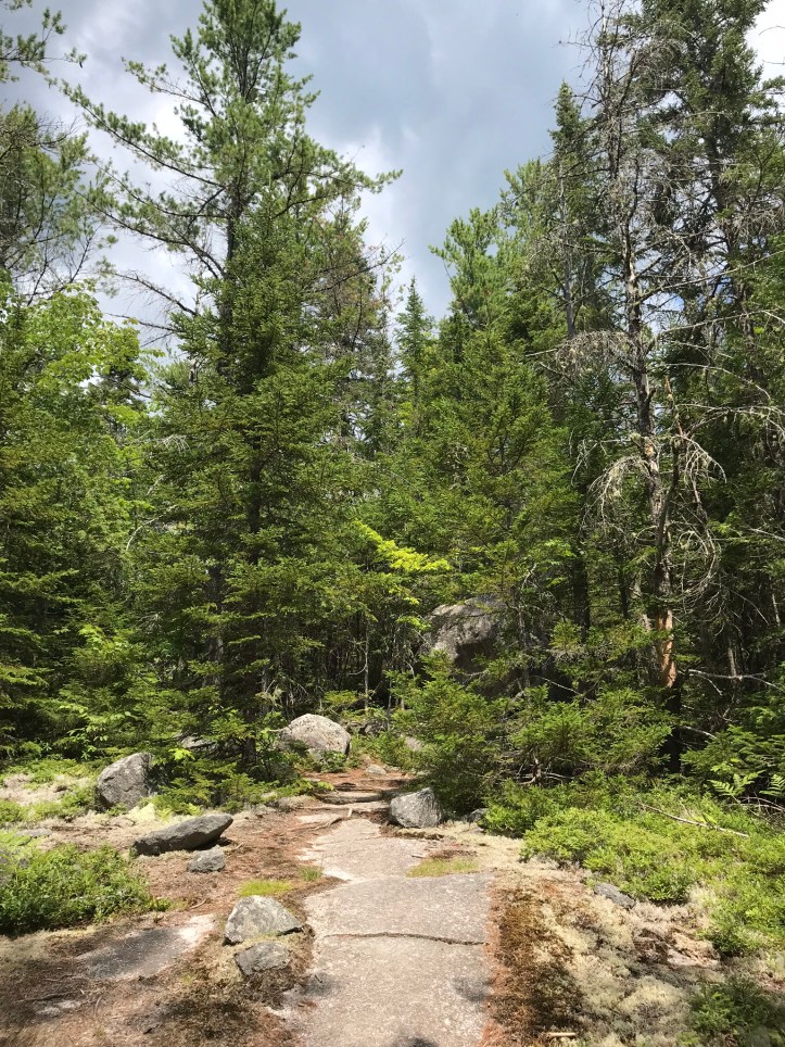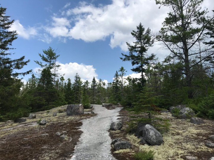 We came across more drainage work, for which we were both grateful. The footing eventually transitioned into rock slab, which felt almost like walking on a sidewalk with frosted green moss on either side of trail and more blueberries!
