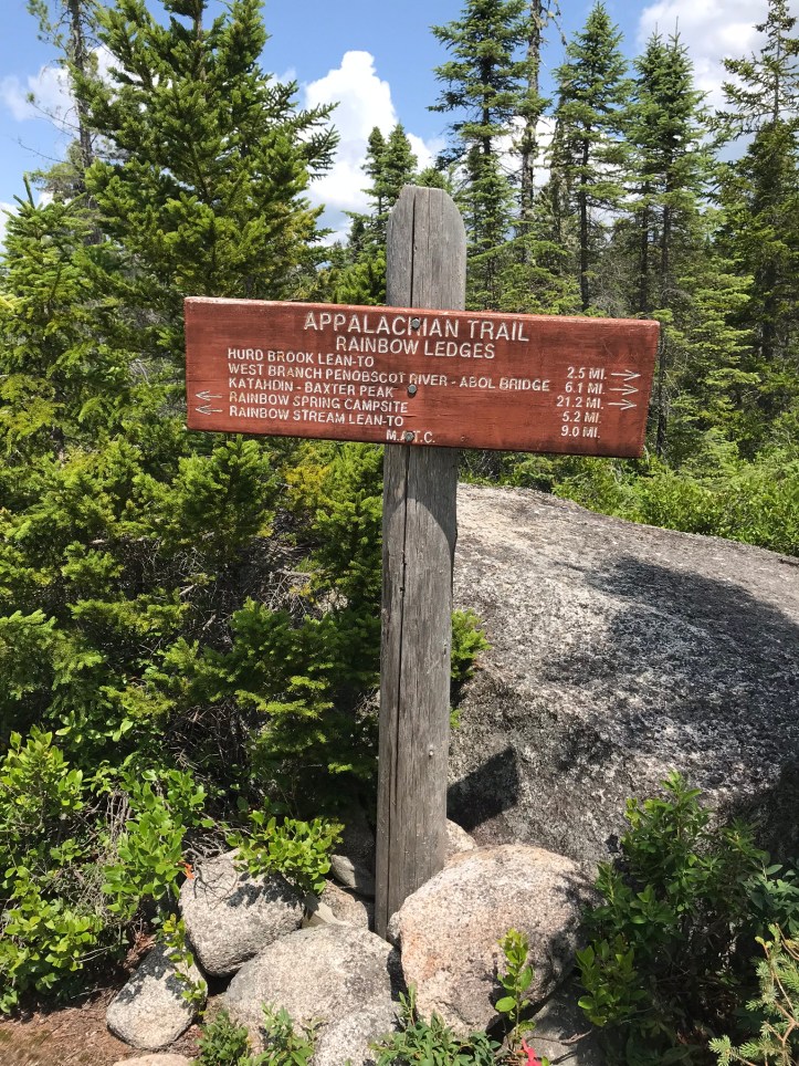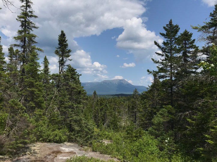 A few texts buzzed through, but none of them were from HQ. We loitered on the ledges for about 15 minutes idly checking our phones and generally being lumps, but we eventually had to keep moving. I sent HQ another text telling her that we would be in touch via GPS. About 5 minutes and a few more blueberries later, we saw Katahdin framed in the trees to our left.