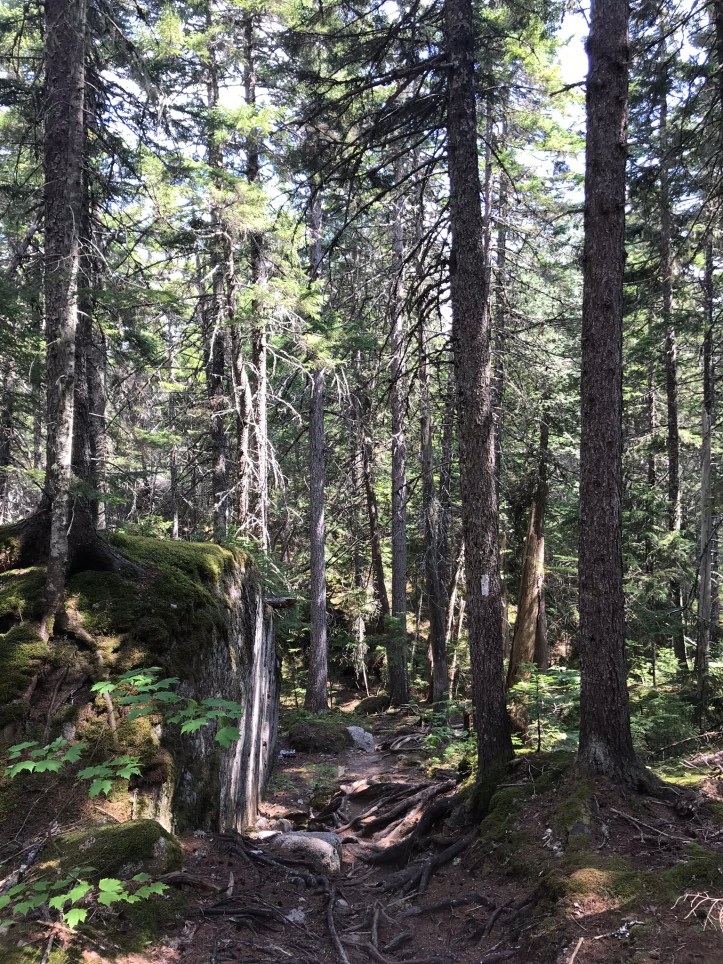 Sunlight glinted off the surface while I snapped a few pictures and checked the map to find that we were standing by Rainbow Lake (so many rainbows). Oakland seemed to be sagging. She pulled out a bar and said that she felt like she was running on fumes even though we’d just recently snacked. I had daydreams about eating an early lunch at the far corner of the lake, but I didn’t say it out loud lest I get shot down before I could handle the rejection. As we plodded down the trail, I planned my case for an early lunch. Soft light filtered through the trees as we picked our way over roots and admired giant boulders covered in ferns that looked like cartoon hair.