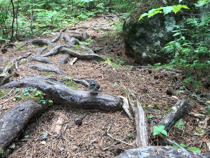 We let mama K out of our sight and continued down the ledges. We saw an older hiker headed our way, and we waited for him to creep up a large step in front of us. I told him to be sure to look to his right at the top of the hill because he seemed to be very focused, and I was worried that he might miss the view. He thanked us and continued with his rickety gait. The descent was manageable. There were a few long steps and roots with some stone steps mixed in. We reached a piney section that continued the monotonous feeling of being stuck in a never ending agility drill made of roots and rocks. I stopped short at the sight of a bird sitting on a root in the middle of the trail. My guess is that it was a thrush fledgling? or maybe a dark eyed junco fledgling? (corrections welcome) I took its picture, and then it hopped/flew off the trail about two feet. Good instincts, kid.