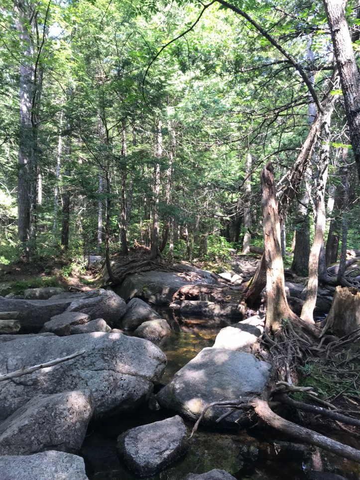 After about thirty more minutes of stumbling, we came to a jumble of giant boulders surrounded by dark water and trees with roots grasping onto rocks. We had to cross the wide stream in order to reach our evening destination, Hurd Brook Lean-to (the last shelter in the 100 mile wilderness).