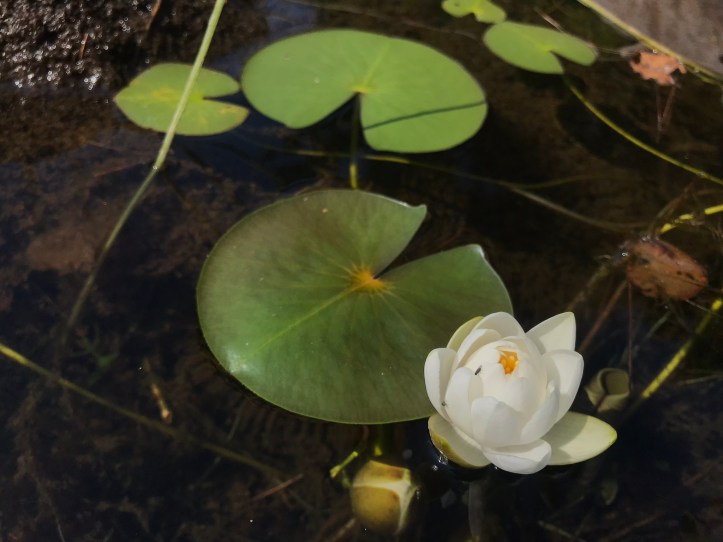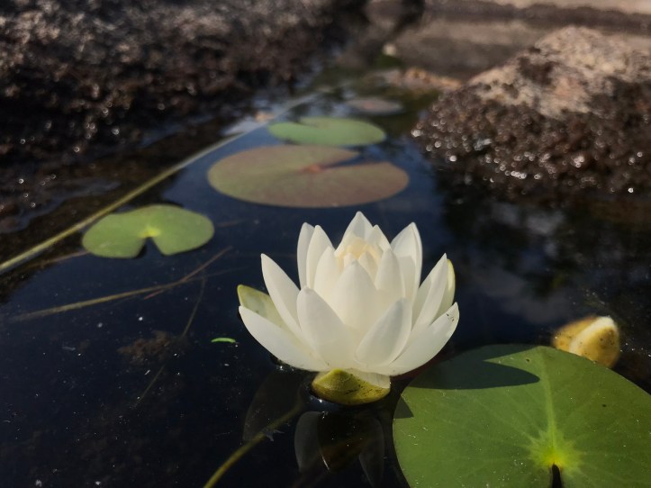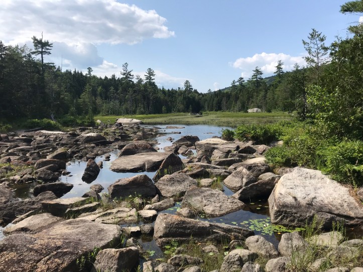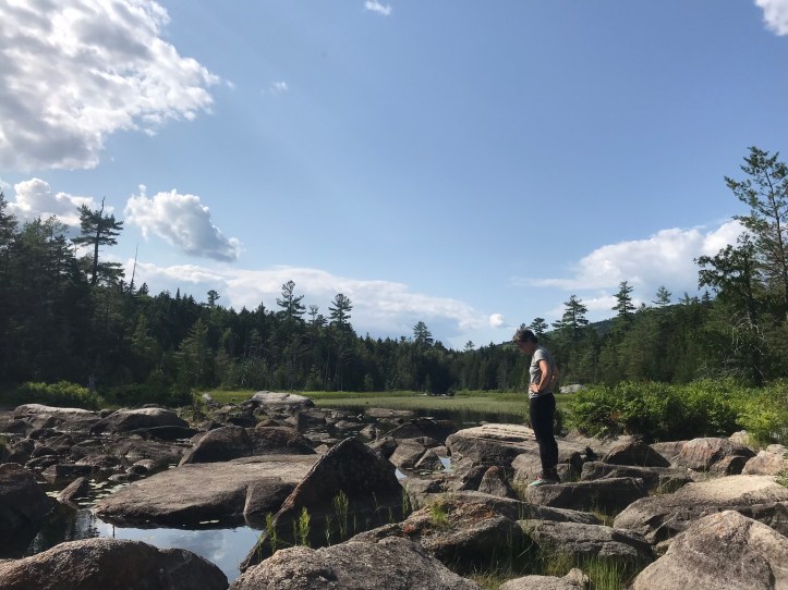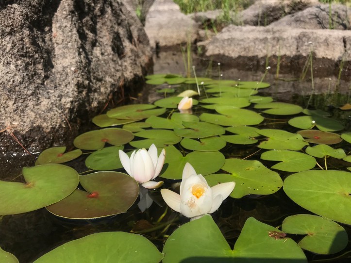 The tenting area was rooty and pretty lumpy. We put our packs down to fully survey the options. None of them were good. We finally settled on the best of the worst. There were roots in all the wrong places and the ground sloped to one side, but we wouldn’t be sleeping with our heads downhill, so maybe my eye wouldn’t swell as much. We sat on nice high rocks and ate snacks and drank water before dealing with tent. One must always consider the hangerbeast when doing evening chores. We cleared the ground and put towels down on the sharpest roots before putting the tent up with ease. Then we sat on our rocks and ate more snacks. We were both starving and ready for dinner, but it was only 4:30pm. I decided to see if I could access the marshy pond that flowed into our water source with the hopes of spotting a moose. I walked towards an opening in the trees and found a series of large boulders that led to a long, narrow pond with blooming lily pads and tall grass that seemed like good moose bait to me (today’s top photo). I called out to Oakland to come find me and she popped out of the woods a minute later. She rock-hopped to where I sat taking pictures of flowers (shocking, I know).