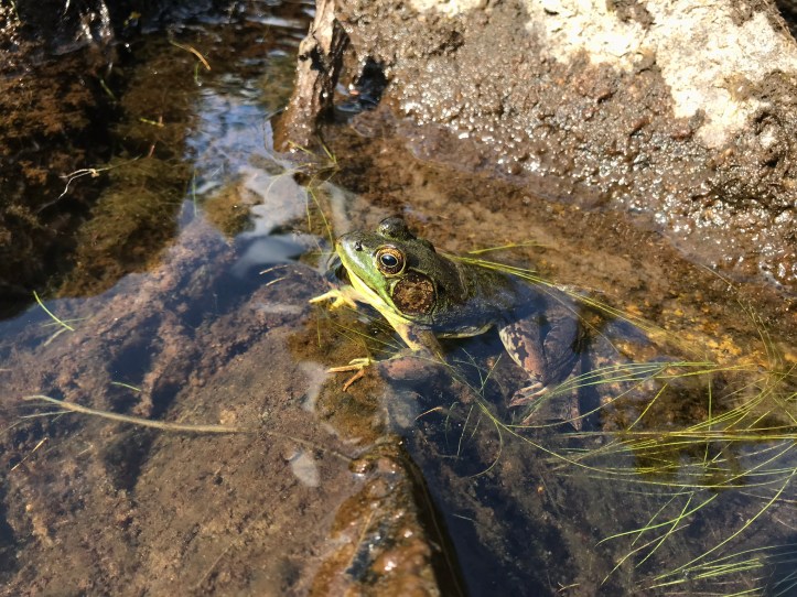 It was so peaceful, and a light breeze kept the bug quotient lower. We lingered for a few minutes before heading back over the rocks towards our tent site. I stopped to take another picture and a piece of trash popped out of my coat pocket and floated downstream. I watched it get caught against a log, so I rock hopped over to retrieve it and found a green frog like the one we saw at the Thunder Hill Shelter’s cistern.