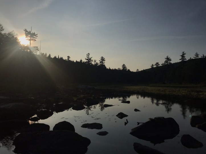 The bugs were getting to Oakland, so we didn’t loiter much past the end of our meal. As we wrapped up, Mary Jane made herself a cup of tea and offered us a “groovy cookie” to help us sleep, but we declined. I put all of my energy into controlling my face as I watched Mary Jane putter around her hammock site, pulling out one single-use item after another. It hurt my feet just watching her scrounge around her mountain of gear. We put our food in the tent, which still felt so wrong and frankly, adds to the clutter. Then we put on our raincoats and grabbed our zseats to go on a moose cruise by the pond. Mary Jane joined us with her tea and her pot cookie, but the lowering sun shining in our faces was too hot for her (or maybe she didn’t feel like sharing the space). Oakland and I settled onto a big flat rock with a good view and watched the minnows and frogs while straining our ears for the sound of moose. It was peaceful but a bit buggier than before. I heard a big crash that had to have been a moose, but one never appeared. Oakland eventually had to escape the bugs. I waited for about 15 more minutes, but no dice.