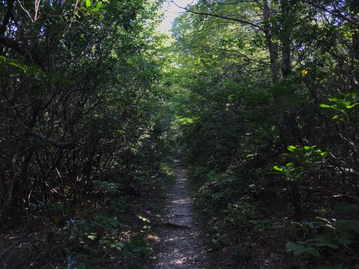 Shortly after turning back onto the AT, I hit a stretch of rocks that made me glad that I hadn’t taken the scramble detour. The terrain eased up after a few minutes of nonsense (that I didn’t photograph, which is indicative of my exhaustion level). I covered about an hour of easy trail through a glowing green tunnel, like so: